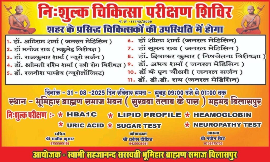 भूमिहार ब्राह्मण समाज द्वारा 31 अगस्त को विशाल निःशुल्क चिकित्सा प्रशिक्षण शिविर