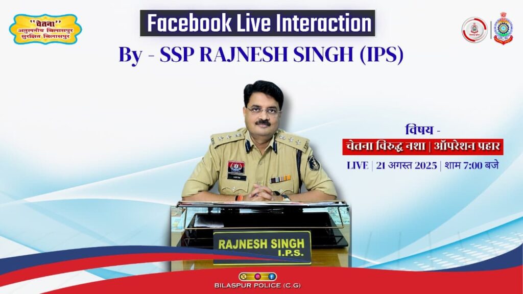 बिलासपुर। नशे के बढ़ते खतरे और अपराधों पर अंकुश लगाने के लिए पुलिस अब जनजागरूकता अभियान को नई दिशा देने जा रही है। इसी कड़ी में एसएसपी रजनेश सिंह फेसबुक LIVE के माध्यम से चेतना विरुद्ध नशा और ऑपरेशन प्रहार पर विशेष संवाद करेंगे। यह कार्यक्रम 21 अगस्त की शाम 7:00 बजे आयोजित होगा।