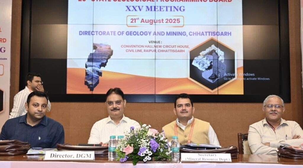 रायपुर। राज्य स्तरीय भू-वैज्ञानिक कार्यक्रम मंडल छत्तीसगढ़ की रजत महोत्सव के रूप में 25वी बैठक आज सिविल लाईन स्थित न्यू सर्किट हाऊस में पी. दयानंद, सचिव, छत्तीसगढ़ शासन, खनिज साधन विभाग एवं अध्यक्ष छत्तीसगढ़ भू-वैज्ञानिक कार्यक्रम मंडल की अध्यक्षता में सम्पन्न हुई। बैठक में रजत बंसल, संचालक भौमिकी तथा खनिकर्म एवं केन्द्र सरकार तथा राज्य शासन के विभिन्न विभागो, उपक्रमों के प्रतिनिधि भी उपस्थित रहे। बैठक का मुख्य उद्देश्य प्रदेश में खनिज संसाधनों के बेहतर उपयोग, नए खनन परियोजनाओं की रूपरेखा तैयार करना और गत वर्ष की उपलब्धियों की समीक्षा करना रहा।