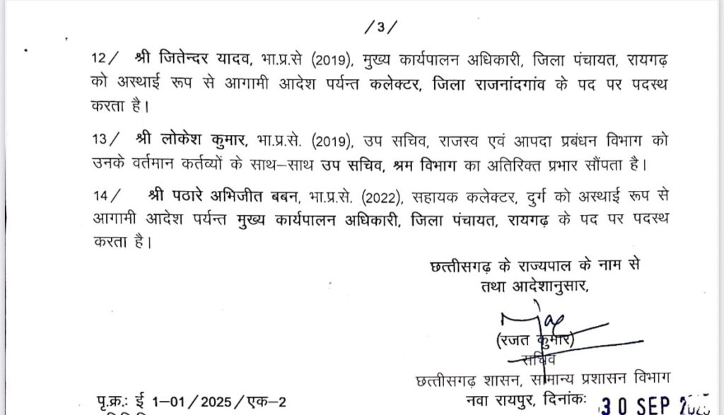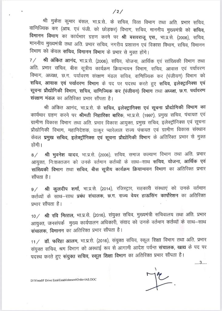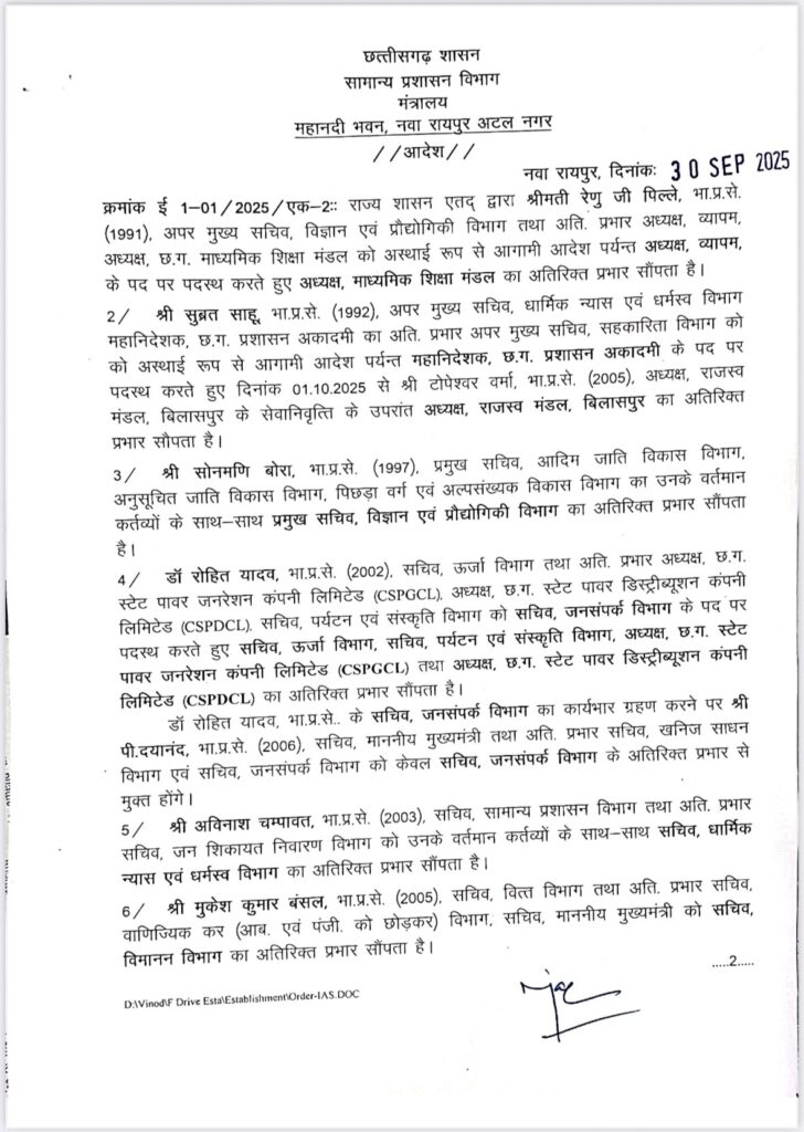 छत्तीसगढ़ में प्रशासनिक फेरबदल, कई आईएएस अफसरों के दायित्व बदले