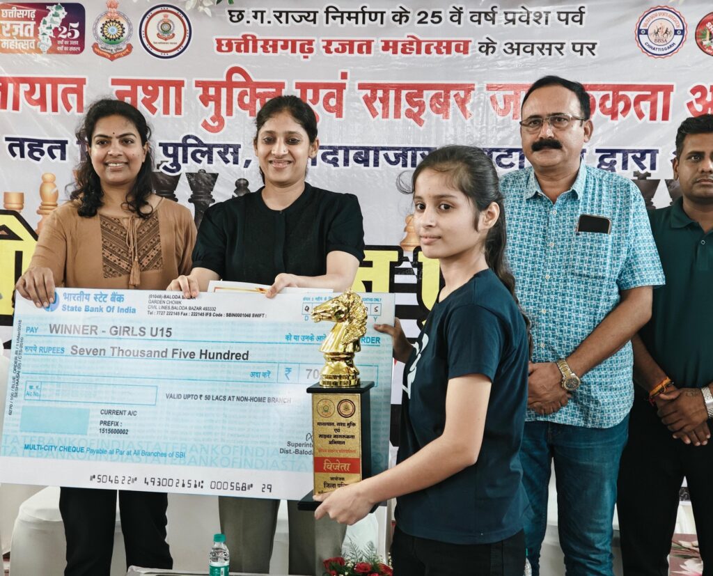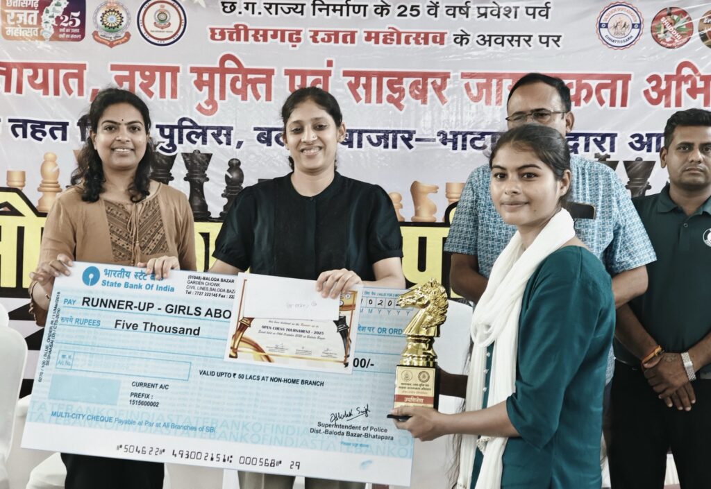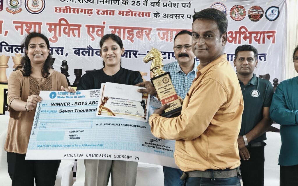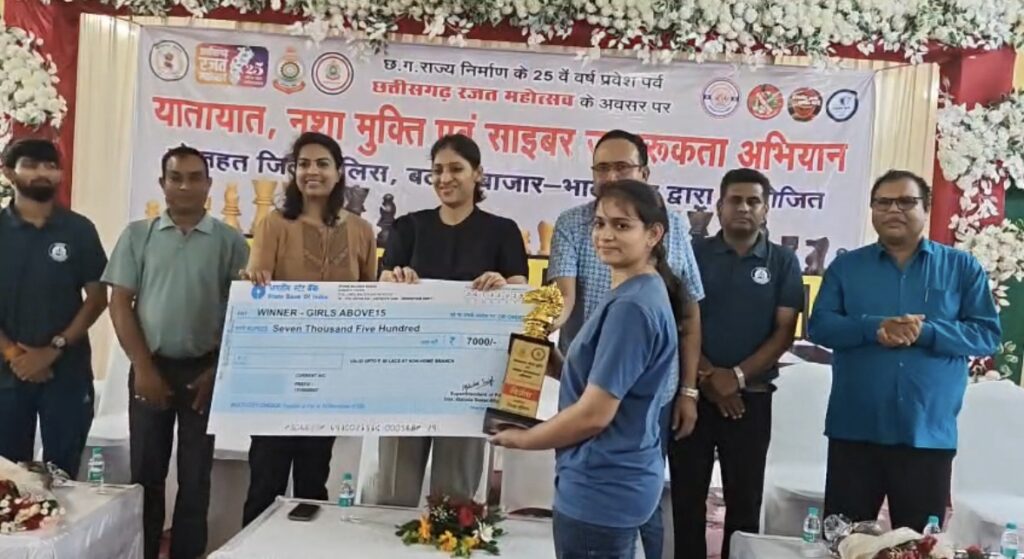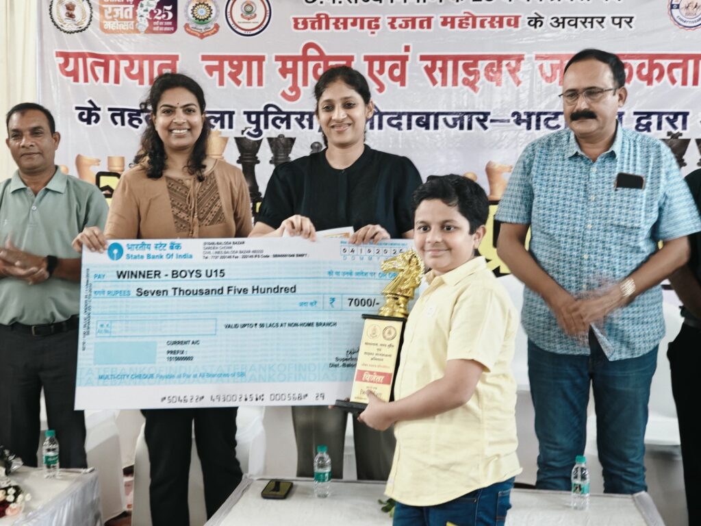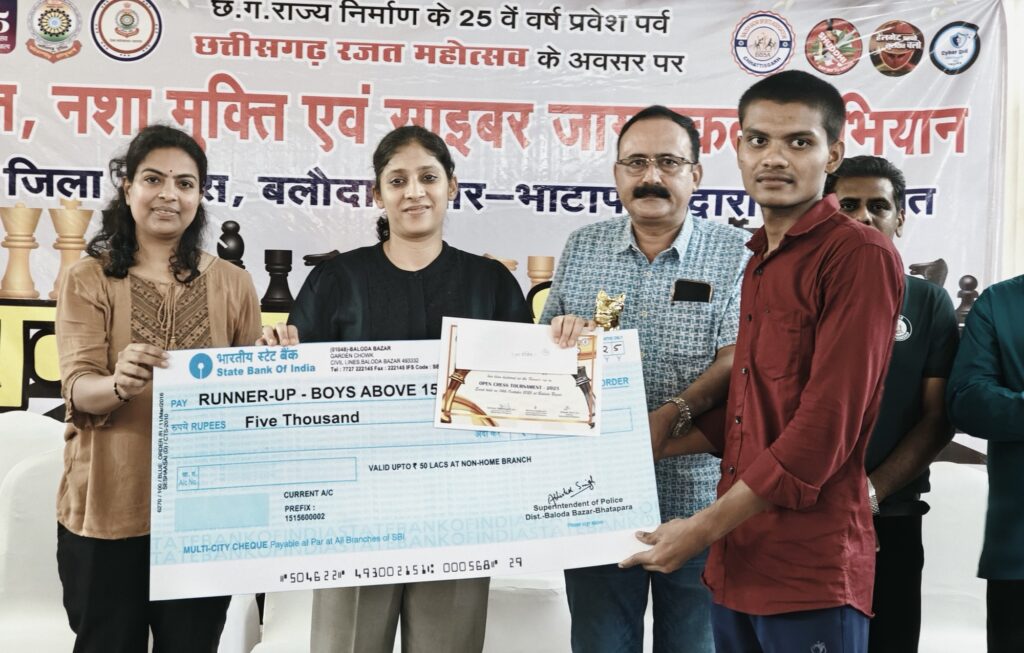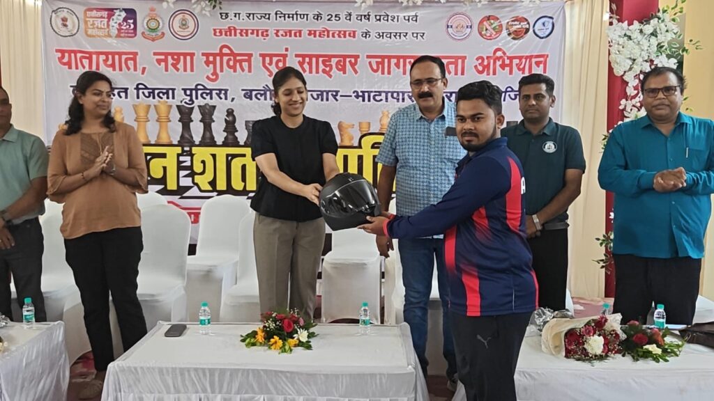 बलौदाबाजार।बलौदाबाजार-भाटापारा पुलिस द्वारा शनिवार को इंडोर स्टेडियम बलौदाबाजार में पहली बार ओपन शतरंज प्रतियोगिता का आयोजन किया गया। छत्तीसगढ़ राज्य निर्माण के 25वें वर्ष प्रवेश पर्व एवं छत्तीसगढ़ रजत महोत्सव के अवसर पर आयोजित इस प्रतियोगिता को यातायात जागरूकता, साइबर जागरूकता एवं नशा मुक्ति अभियान से जोड़ा गया था।