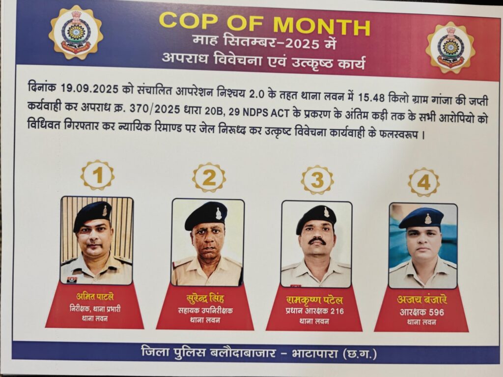 बलौदाबाजार-भाटापारा।जिले में अपराधियों के खिलाफ लगातार कार्रवाई कर रही पुलिस को एक बार फिर बड़ी सफलता मिली है। अपराध नियंत्रण में उत्कृष्ट प्रदर्शन और अपराधियों की धरपकड़ में उल्लेखनीय भूमिका निभाने वाले चार पुलिस अधिकारी-कर्मचारियों को कॉप ऑफ द मंथ (Cop of the Month) के रूप में सम्मानित किया गया।
