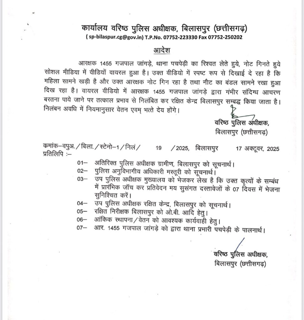 बिलासपुर ।एसएसपी आईपीएस रजनेश सिंह ने पचपेड़ी थाने में पदस्थ आरक्षक गजपाल जांगड़े को तत्काल प्रभाव से निलंबित कर दिया है। यह कार्रवाई उस वीडियो के वायरल होने के बाद की गई जिसमें आरक्षक जांगड़े को पैसे गिनते हुए और पलंग पर रखे रुपये के साथ देखा गया है।