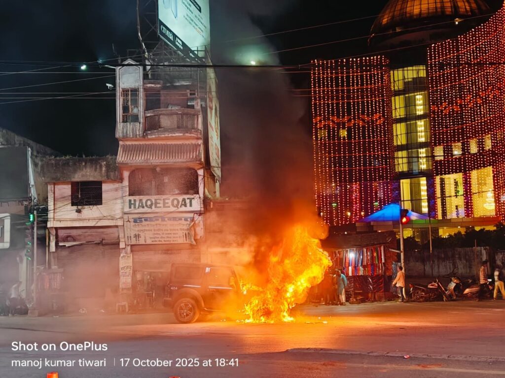सिविल लाइन थाना प्रभारी सुम्मत साहू ने बताया कि शाम करीब छह बजे के आसपास सीएमडी चौक की ओर से अग्रसेन चौक की दिशा में आ रही थार में अचानक आग लग गई। वाहन के बोनट से धुआं उठता देख ड्राइवर ने तुरंत गाड़ी सड़क किनारे रोक दी। वह जैसे ही नीचे उतरा, सामने के हिस्से में आग तेजी से फैल गई। कुछ ही सेकंड में वाहन लपटों से घिर गया। यह नजारा देखकर आसपास के लोग घबरा गए। त्योहार के कारण पहले से ही व्यस्त चौराहे पर लोगों की भीड़ और वाहनों की रफ्तार रुक गई। पुलिस ने मौके पर पहुंचकर तत्काल यातायात डायवर्ट किया और भीड़ को पीछे हटाया। आग की सूचना मिलते ही फायर ब्रिगेड की टीम पहुंची और पानी की बौछारों से आग पर काबू पाया। सौभाग्य से हादसे में कोई जनहानि नहीं हुई, लेकिन वाहन का अगला हिस्सा बुरी तरह जल गया।