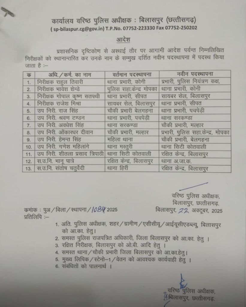 बिलासपुर।जिले के एसएसपी रजनेश सिंह ने प्रशासनिक दृष्टि से बड़े पैमाने पर निरीक्षकों और उपनिरीक्षकों के तबादले के आदेश जारी किए हैं। आदेश में कहा गया है कि यह तबादले अस्थायी तौर पर आगामी आदेश तक प्रभावशील रहेंगे।देखे आदेश