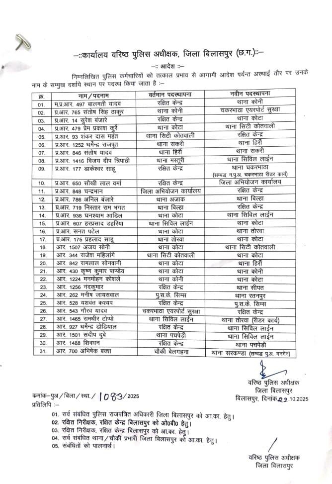 बिलासपुर। जिले में पुलिस विभाग ने एक बार फिर बड़ा प्रशासनिक फेरबदल किया है। एसएसपी रजनेश सिंह ने बुधवार को 31 पुलिस कर्मियों का तबादला आदेश जारी किया। इनमें 17 प्रधान आरक्षक और 14 आरक्षक शामिल हैं।