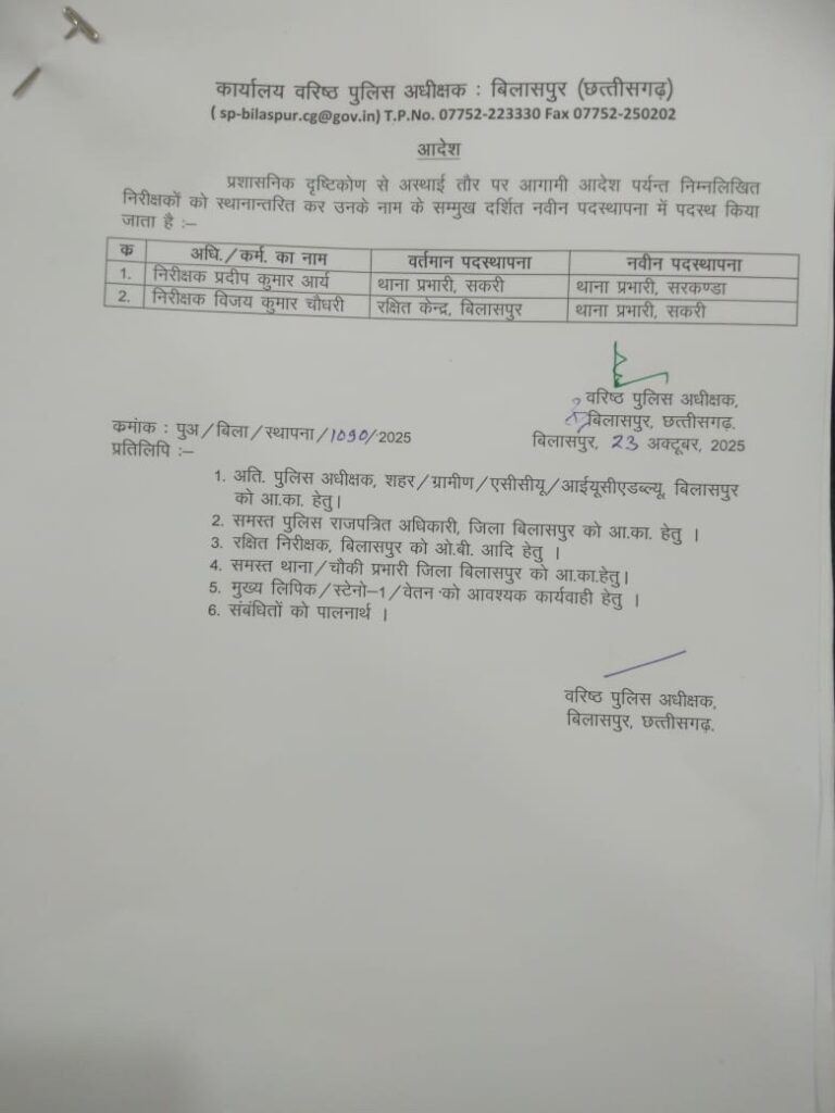यह आदेश वरिष्ठ पुलिस अधीक्षक बिलासपुर आईपीएस रजनेश सिंह द्वारा गुरुवार को जारी किया गया। स्थानांतरण आदेश प्रशासनिक दृष्टिकोण से अस्थायी तौर पर आगामी आदेश तक प्रभावशील रहेगा।