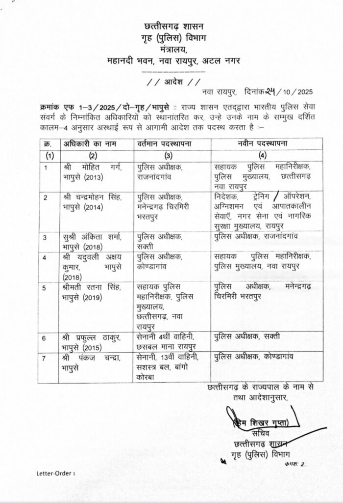 रायपुर।छत्तीसगढ़ शासन के गृह पुलिस विभाग ने शनिवार को भारतीय पुलिस सेवा भापुसे के अधिकारियों के स्थानांतरण के आदेश जारी किए हैं। राज्य शासन ने सात अधिकारियों को नई पदस्थापना दी है। यह आदेश गृह विभाग के सचिव शिखर गुप्ता द्वारा राज्यपाल के नाम से जारी किया गया है।देखें आदेश