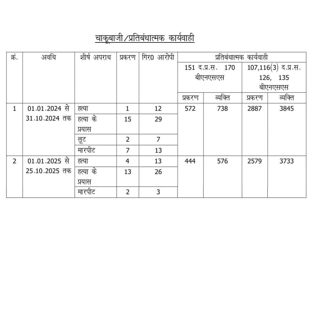 एसपी की सतर्कता और नेतृत्व का परिणाम, 2024 में चाकूबाजी के 25 प्रकरण में जहाँ 61 आरोपियों को गिरफ्तार किया गया ,वहीं 2025 में अब तक 19 मामले 42 आरोपियों को भेजा गया जेल