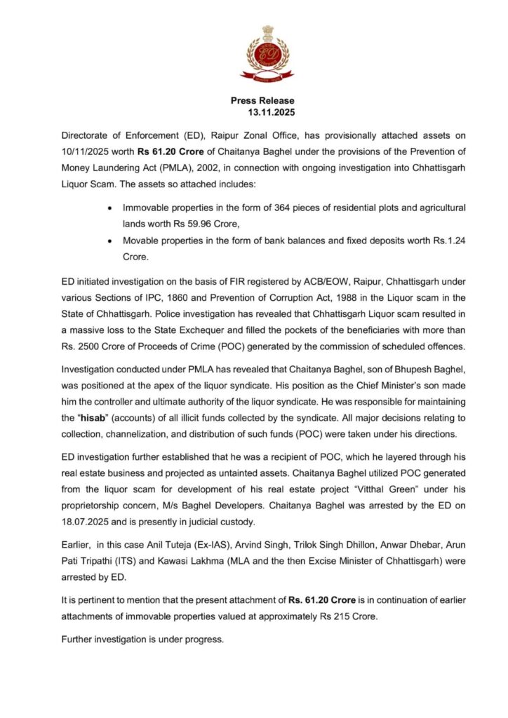 रायपुर। छत्तीसगढ़ में हुए दो हजार करोड़ रुपये से अधिक के शराब घोटाले में पूर्व मुख्यमंत्री भूपेश बघेल के बेटे चैतन्य बघेल को ईडी ने गिरफ्तार किया है। 18 जुलाई से चैतन्य बघेल ज्यूडिशियल रिमांड पर जेल में है। प्रवर्तन निदेशालय ईडी रायपुर क्षेत्रीय कार्यालय ने छत्तीसगढ़ शराब घोटाले की चल रही जांच के सिलसिले में धन शोधन निवारण अधिनियम पीएमएलए 2002 के प्रावधानों के तहत 10 नवंबर 2025 को चैतन्य बघेल की 61.20 करोड़ रुपये की संपत्ति अस्थायी रूप से कुर्क की है। इसके पहले ईडी ने चैतन्य बघेल की 215 करोड़ रुपये मूल्य की अचल संपत्तियों की कुर्की की थी।