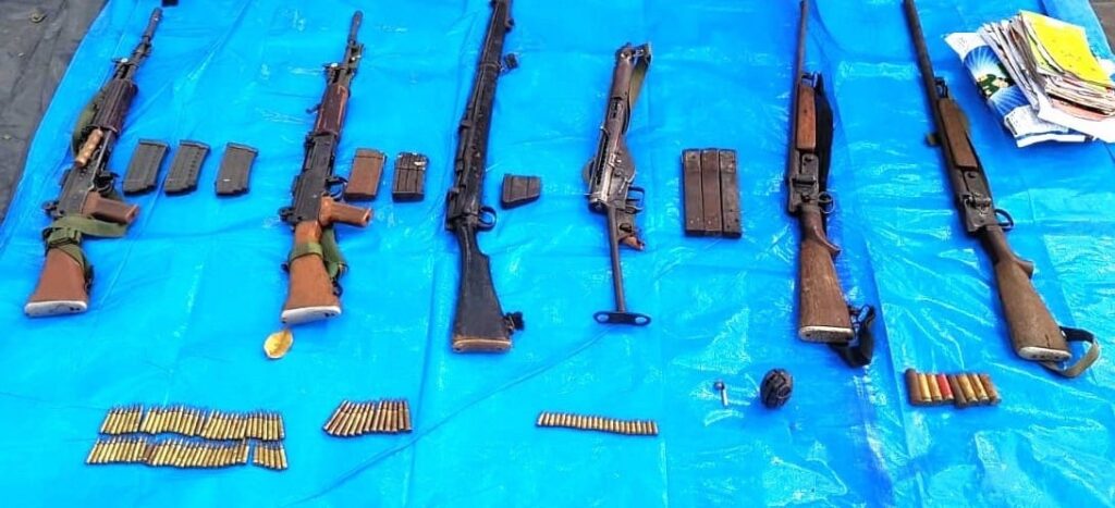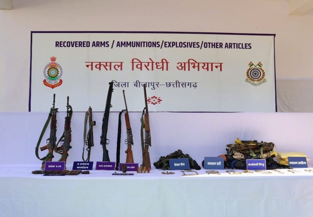 मुठभेड़ स्थल से दो इंसास रायफल, एक 9 एमएम कार्बाइन एक .303 रायफल, एक सिंगल शॉट गन 12 बोर बंदूक बड़ी संख्या में कारतूस रेडियो सेट ग्रेनेड स्कैनर हैंड ग्रेनेड माओवादी वर्दी और साहित्य समेत अन्य सामग्री बरामद की गई।