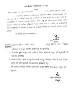 कलेक्टर कार्यालय द्वारा जारी आदेश में स्पष्ट किया गया है कि रायपुर प्रेस क्लब की कार्यकारिणी का चुनाव निर्वाचन अधिकारी के मार्गदर्शन एवं पर्यवेक्षण में पारदर्शी तरीके से संपन्न कराया जाएगा। यह आदेश तत्काल प्रभाव से लागू हो गया है।