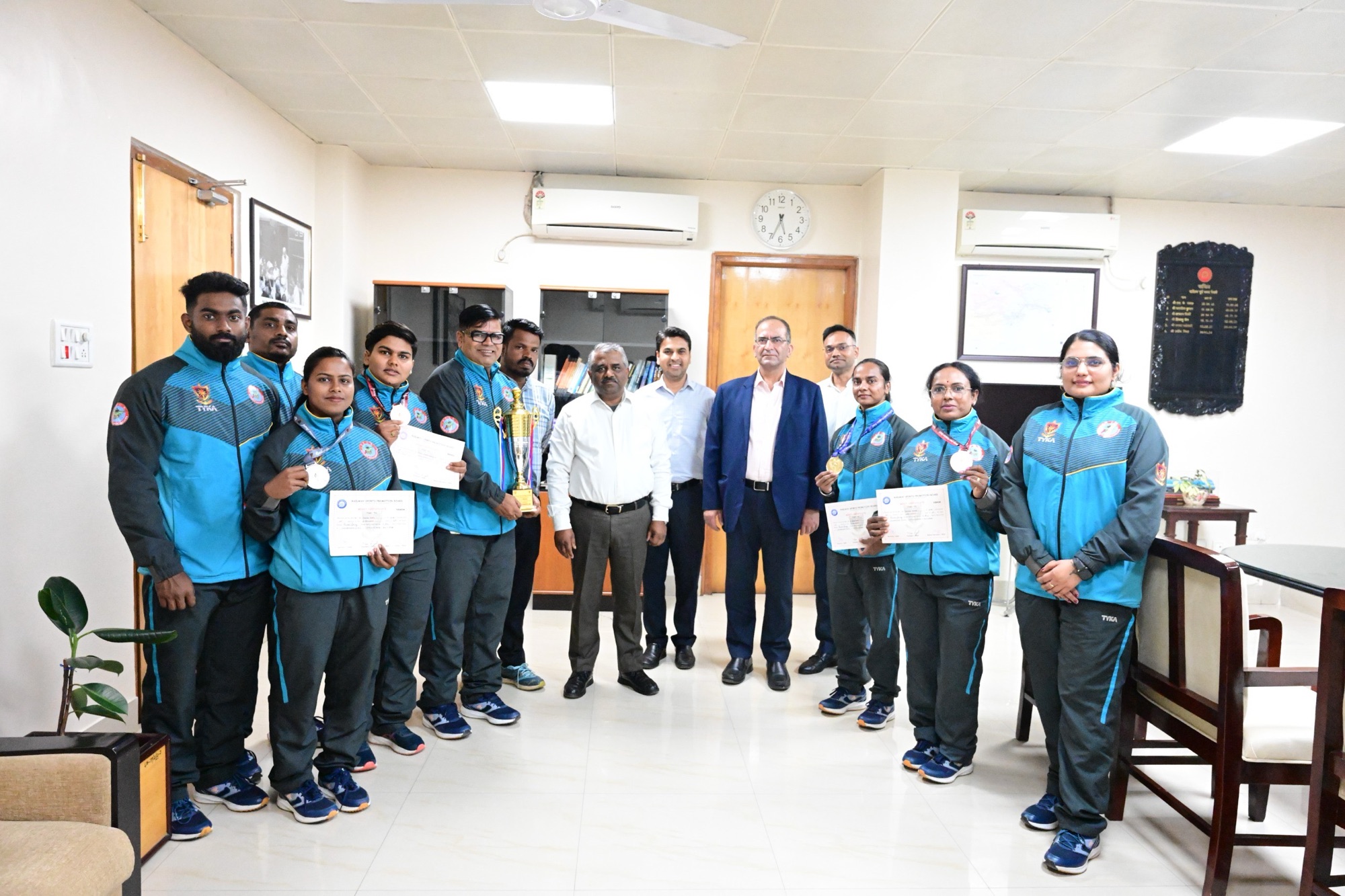 प्रतियोगिता में उत्कृष्ट प्रदर्शन करने वाली महिला खिलाड़ियों ने आज 26 नवम्बर 2025 को दक्षिण पूर्व मध्य रेलवे के महाप्रबंधक श्री तरुण प्रकाश से सौजन्य भेंट की। महाप्रबंधक ने सभी खिलाड़ियों को उनकी सफलता पर बधाई देते हुए कहा कि टीम का यह प्रदर्शन पूरे रेलवे परिवार के लिए प्रेरणास्रोत है। उन्होंने खिलाड़ियों को भविष्य में भी नई सफलताएँ अर्जित करने के लिए प्रोत्साहित किया।