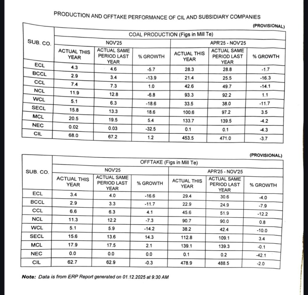 नई दिल्ली।कोल इंडिया लिमिटेड और उसकी सहायक कंपनियों का अप्रैल से नवंबर 2025 तक का उत्पादन एवं ऑफटेक उठाव आंकड़ा जारी हुआ है। जहां कुछ क्षेत्रों में हल्की बढ़त दर्ज की गई है, वहीं कई सहायक कंपनियों में पिछले वर्ष की समान अवधि की तुलना में गिरावट देखने को मिली है।