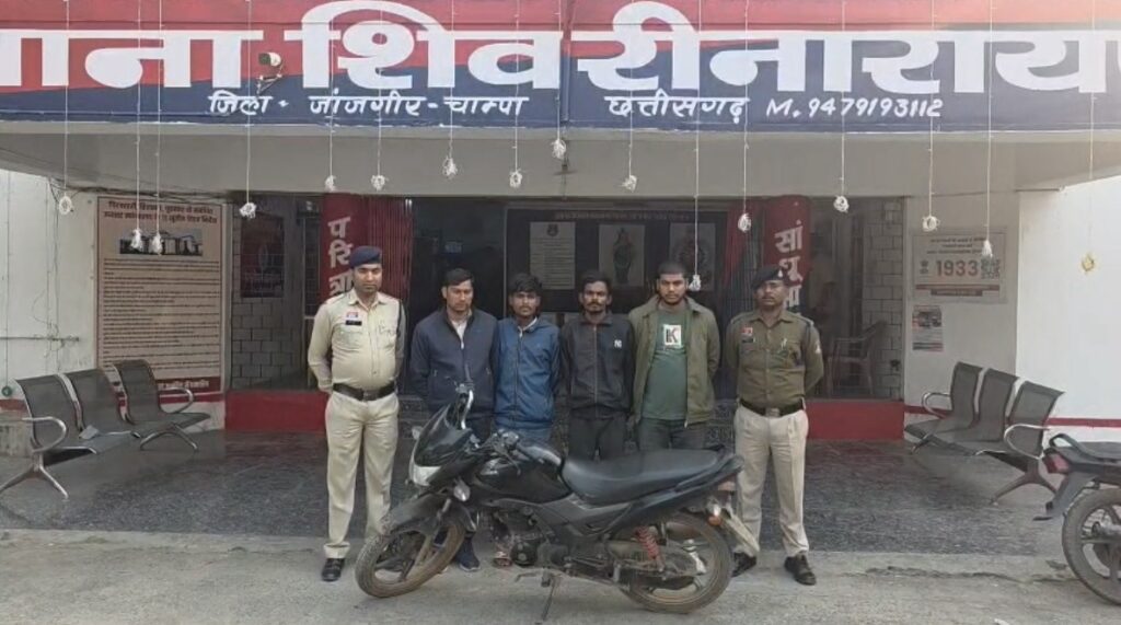इस मामले में पुलिस ने करन दिनकर पिता पुनीराम दिनकर  निवासी खाल्हेपारा वार्ड 09 भवतरा, थाना शिवरीनारायण अरुण मनहर, पिता कमलसाय मनहर निवासी कुथुर थाना पामगढ़ श्यामजी सिन्हा, पिता कोमल सिन्हा निवासी अंबेडकर चौक रहसबेड़ा वार्ड 15 अकलतरा कार्तिकेश्वर रात्रे, पिता गणेशराम रात्रे निवासी खैरा थाना कसडोल जिला बलौदाबाजार हाजिर निवासी चेउडीह वृद्ध विहार थाना पामगढ़ के साथ ही एक विधि के विरुद्ध संघर्षरत बालक को भी हिरासत में लिया गया।इन आरोपियो से घटना में प्रयुक्त मोटरसाइकिल 5 मोबाइल फोन जप्त किया गया है ।