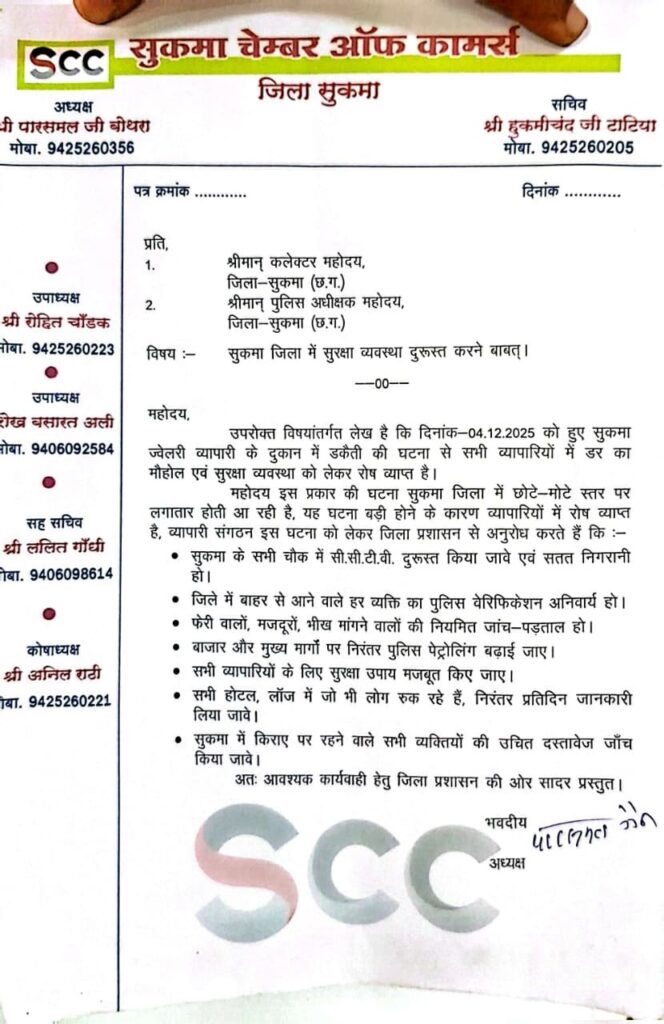 सुकमा। 4 दिसंबर 2025 को शहर के एक ज्वेलरी व्यापारी की दुकान में हुई डकैती की वारदात से स्थानीय व्यापारियों में भारी आक्रोश व्याप्त है। घटना के बाद व्यापार मंडल के प्रतिनिधियों ने 5 दिसंबर को कलेक्टर एवं पुलिस अधीक्षक के नाम ज्ञापन सौंपकर सुरक्षा व्यवस्था को सुदृढ़ करने की मांग की।