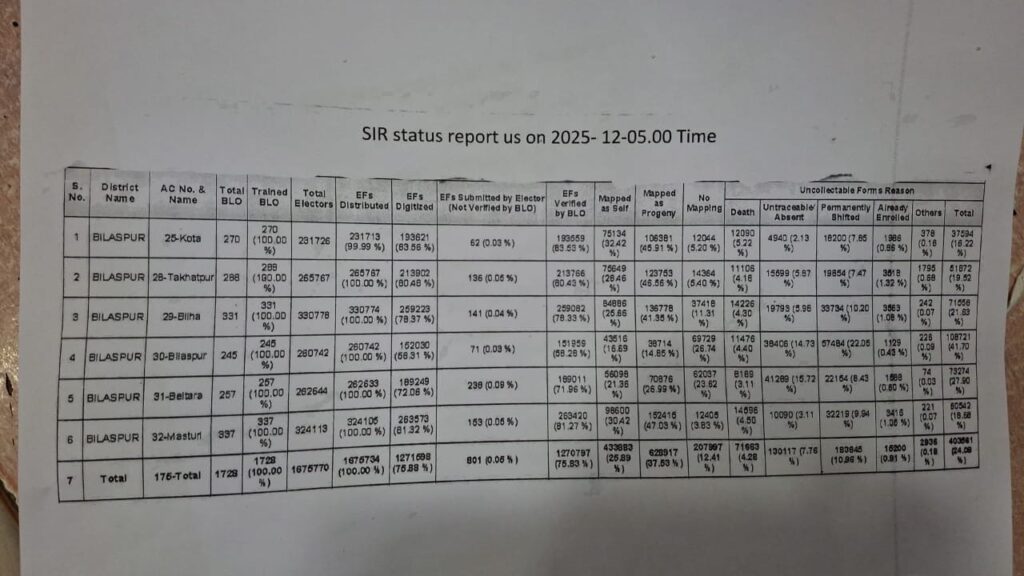 छत्तीसगढ़,बिलासपुर, 5 दिसम्बर 2025। कलेक्टर संजय अग्रवाल के निर्देश पर उप जिला निर्वाचन अधिकारी एवं अपर कलेक्टर शिवकुमार बनर्जी ने शुक्रवार को विभिन्न राजनीतिक दलों की बैठक आयोजित की। बैठक में विशेष गहन पुनरीक्षण एसआईआर कार्य की वर्तमान प्रगति प्रस्तुत की गई।