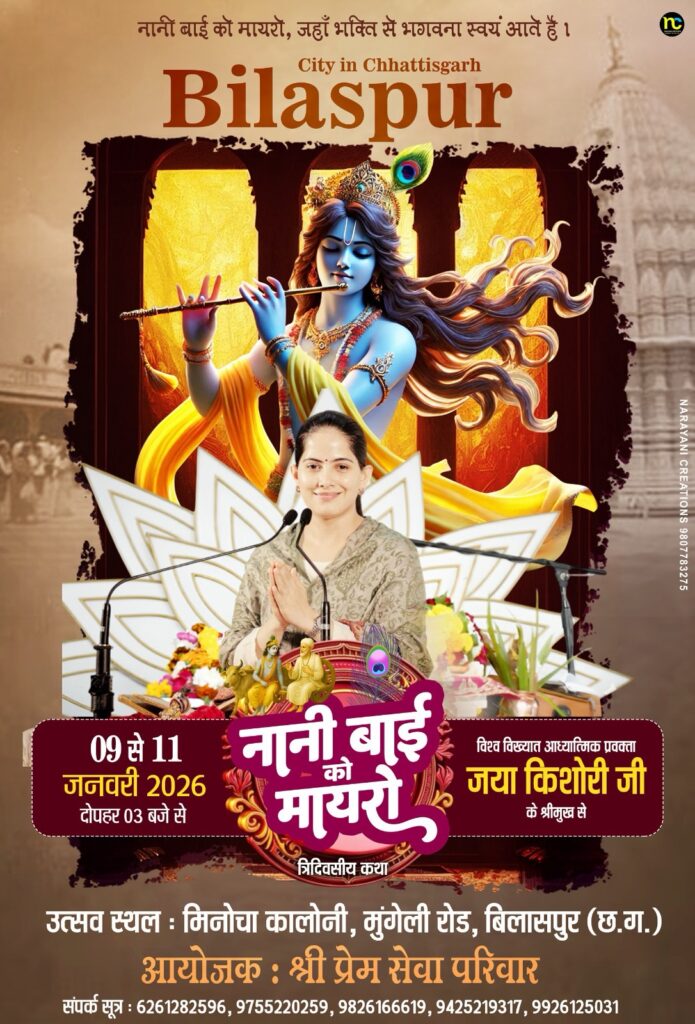 बिलासपुर। विश्व विख्यात आध्यात्मिक कथावाचक जया किशोरी के सान्निध्य में मिनोचा कॉलोनी स्थित गार्डन परिसर में 9 से 11 जनवरी तक नानी बाई का मायरा कथा एवं भजन कार्यक्रम का आयोजन किया जा रहा है। तीन दिवसीय इस धार्मिक आयोजन का आयोजन श्री प्रेम सेवा परिवार द्वारा किया जा रहा है, जिसकी तैयारियां जोर-शोर से चल रही हैं।