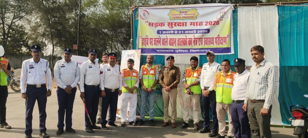 बिलासपुर। सड़क सुरक्षा माह के तहत बिलासपुर–रायपुर राष्ट्रीय राजमार्ग क्रमांक 130 पर स्थित भोजपुरी टोल प्लाजा के समीप यातायात पुलिस बिलासपुर द्वारा वाहन चालकों का प्रशिक्षण एवं वृहद स्वास्थ्य व नेत्र परीक्षण शिविर आयोजित किया गया। कार्यक्रम वरिष्ठ पुलिस अधीक्षक बिलासपुर रजनेश सिंह के निर्देश पर आयोजित किया गया।