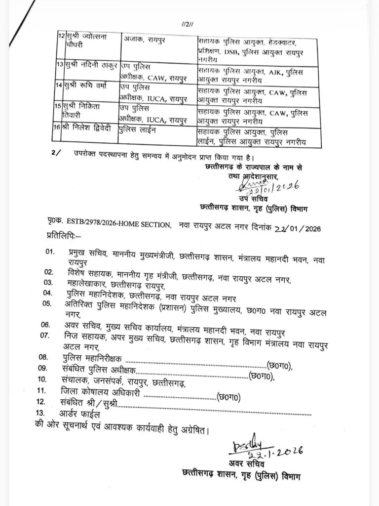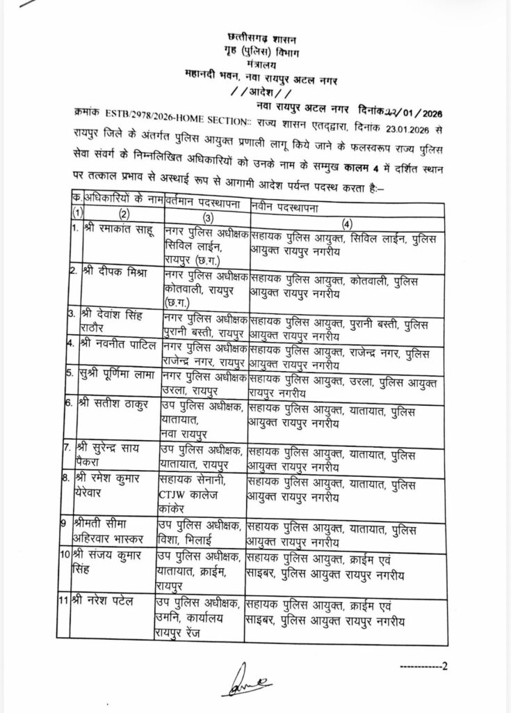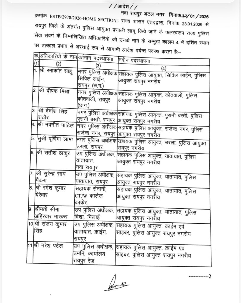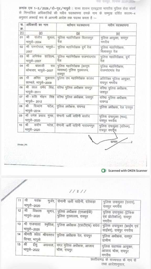 बता दें कि CBN.36 ने छत्तीसगढ़ की राजधानी रायपुर में शुरू हो रहे पुलिस कमिश्नर सिस्टम और पहले पुलिस कमिश्नर को लेकर पहले ही बिलासपुर रेंज के आईजी आईपीएस डॉ संजीव शुक्ला के नाम को लेकर संभावना जता दी थी। राज्य शासन द्वारा जारी स्थानांतरण आदेश में बिलासपुर रेंज के आईजी संजीव शुक्ला का नाम पहले क्रम पर है। उनको रायपुर नगर का पहला पुलिस कमिश्नर बनाया गया है।इसी तरह अन्य पदस्थनाये की गई है देखें सूची ,