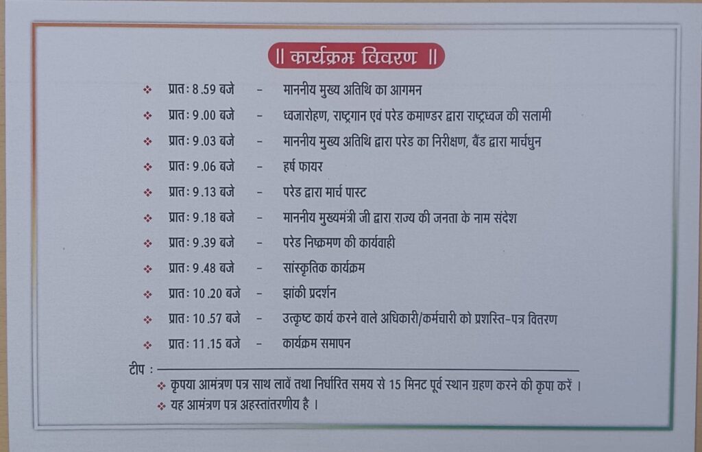 जारी मिनट-टू-मिनट कार्यक्रम के अनुसार मुख्य अतिथि मुख्यमंत्री विष्णुदेव साय का आगमन प्रातः 8.59 बजे होगा। प्रातः 9 बजे ध्वजारोहण एवं राष्ट्रगान होगा। इसके उपरांत प्रातः 9.03 बजे मुख्यमंत्री द्वारा परेड का निरीक्षण किया जाएगा। प्रातः 9.06 बजे हर्ष फायर तथा प्रातः 9.13 बजे परेड द्वारा मार्च-पास्ट किया जाएगा।