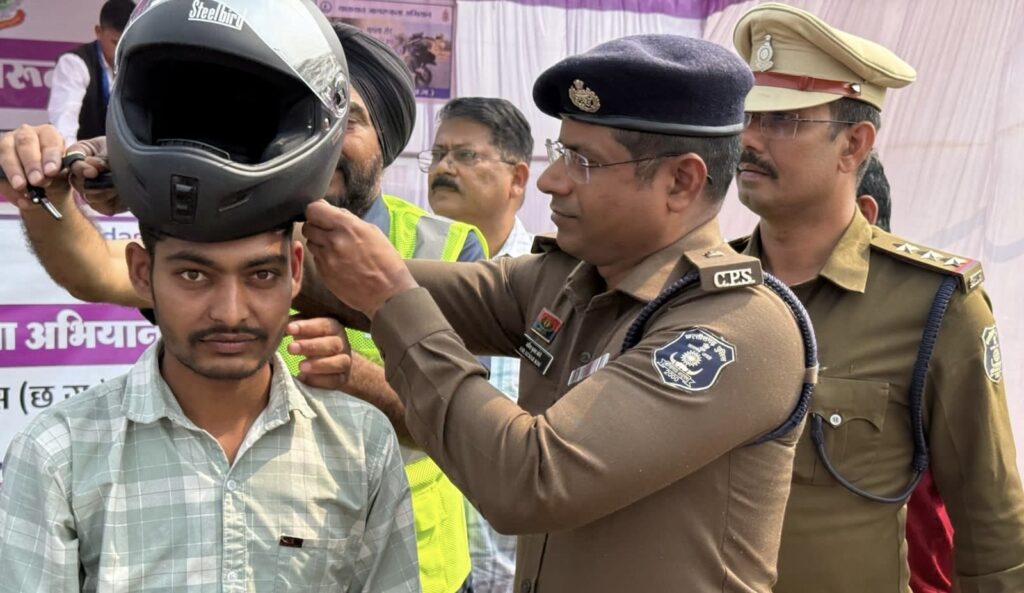 बिना हेलमेट वाहन चालकों पर चालानी कार्रवाई, नि:शुल्क हेलमेट वितरित