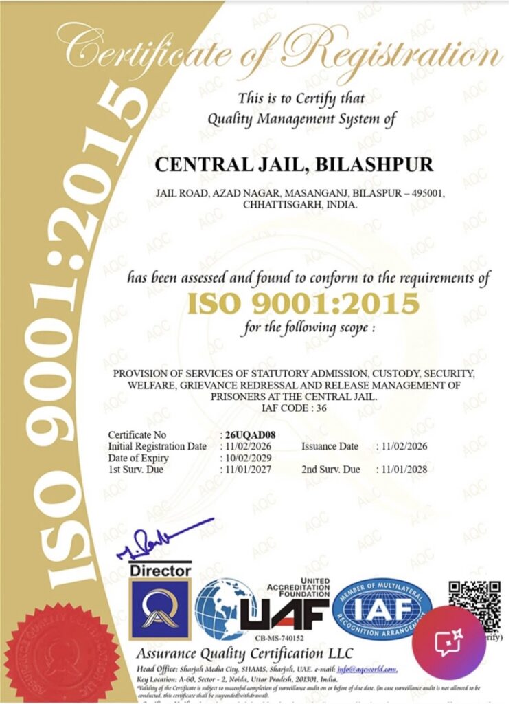 बिलासपुर, 12 फरवरी 2026।उप मुख्यमंत्री एवं जेल विभाग के प्रभारी विजय शर्मा के निर्देशा पर छत्तीसगढ़ की केंद्रीय जेलों में राष्ट्रीय व अंतरराष्ट्रीय मानकों के अनुरूप गुणवत्ता प्रबंधन प्रणाली को सुदृढ़ करने की दिशा में महत्वपूर्ण पहल की गई है। इसी क्रम में राज्य की चार केंद्रीय जेलों बिलासपुर रायपुर दुर्ग एवं अंबिकापुर को आईएसओ 9001:2015 प्रमाणन प्रदान किया गया है।