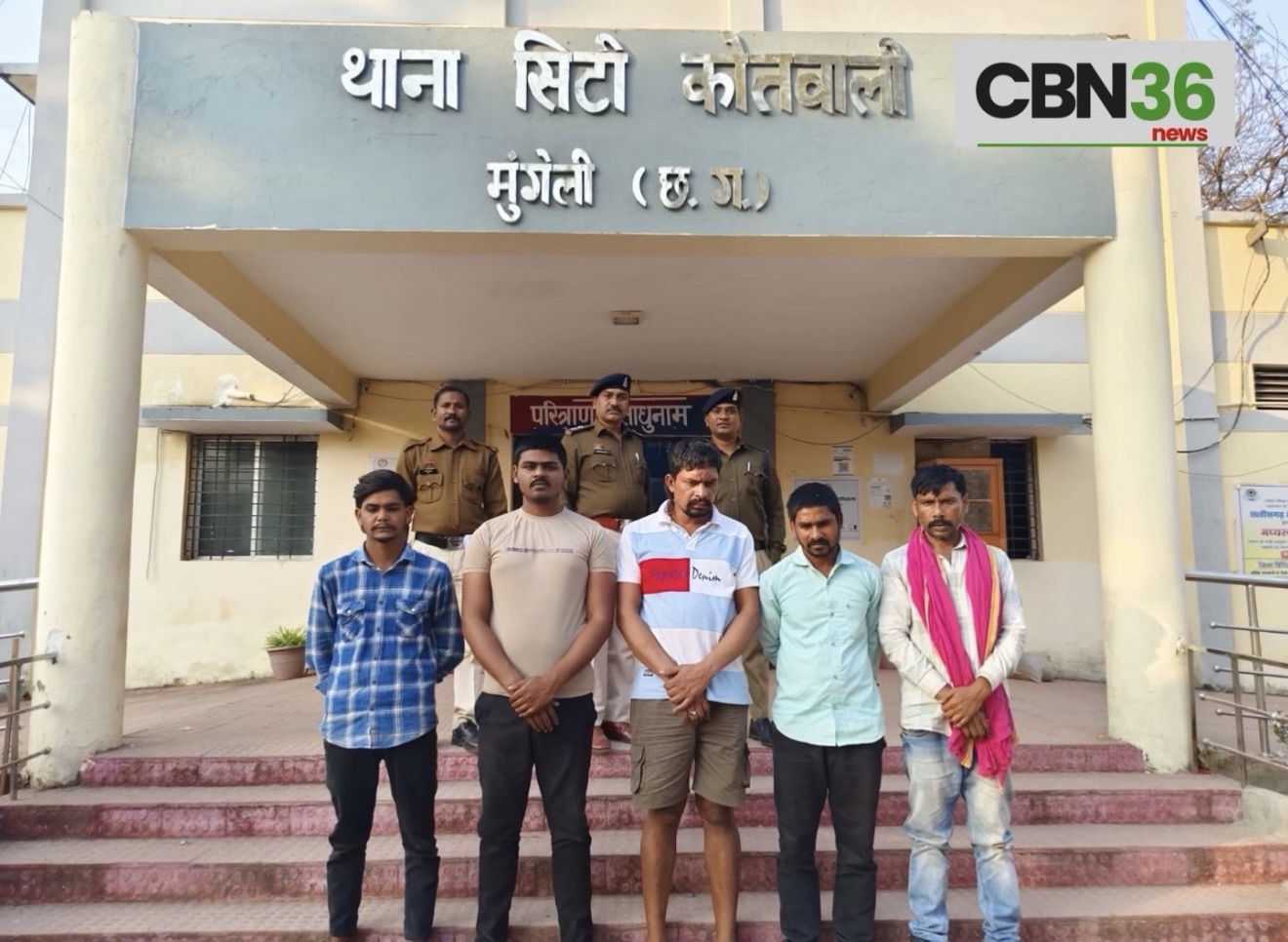 गिरफ्तार आरोपियों में अजय देवांगन पिता जुगरू उम्र 40 वर्ष निवासी शिक्षक नगर अम्बेडकर वार्ड मुंगेली कृष्ण कमल डाहिरे पिता रघुराज उम्र 22 वर्ष निवासी पड़ाव चौक मुंगेली कोमल यादव पिता बालाराम उम्र 22 वर्ष निवासी वार्ड क्रमांक 21 खर्रीपारा किशोर ध्रुव पिता स्व. राजेन्द्र  36 वर्ष निवासी झझपुरी खुर्द थाना जरहागांव अमित साहू पिता स्व.बाबुराम उम्र 38 वर्ष निवासी झझपुरी खुर्द थाना जरहागांव शामिल हैं।