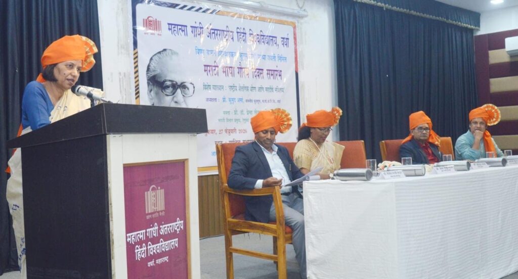 वर्धा।महात्मा गांधी अंतरराष्ट्रीय हिंदी विश्वविद्यालय में मराठी भाषा गौरव दिवस उत्साहपूर्वक मनाया गया। कार्यक्रम की विशेषता यह रही कि कुलपति प्रो. कुमुद शर्मा ने पहली बार मराठी भाषा में संबोधित करते हुए अभिजात मराठी के संरक्षण एवं संवर्धन को सामूहिक दायित्व बताया।