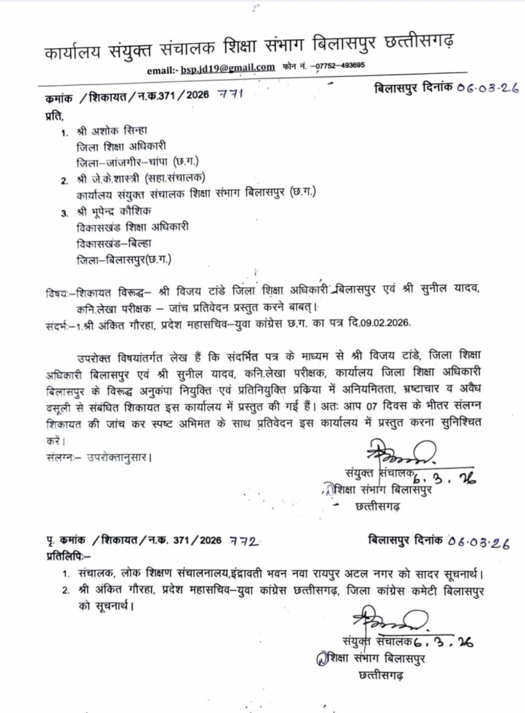 बिलासपुर ।जिला शिक्षा विभाग में नियुक्ति, अटैचमेंट और प्रमोशन में कथित भ्रष्टाचार के आरोपों ने अब नया मोड़ ले लिया है। कांग्रेस नेता अंकित गौराहा की शिकायत के बाद संभागीय संयुक्त संचालक शिक्षा आर.पी.आदित्य ने जिला शिक्षा अधिकारी विजय टांडे और स्थापना शाखा के बाबू सुनील यादव के खिलाफ जांच के आदेश जारी किए हैं। इसके लिए तीन सदस्यीय जांच समिति का गठन किया गया है,जिसे सात दिन के भीतर रिपोर्ट प्रस्तुत करने का निर्देश दिया गया है।