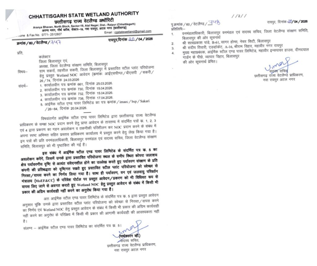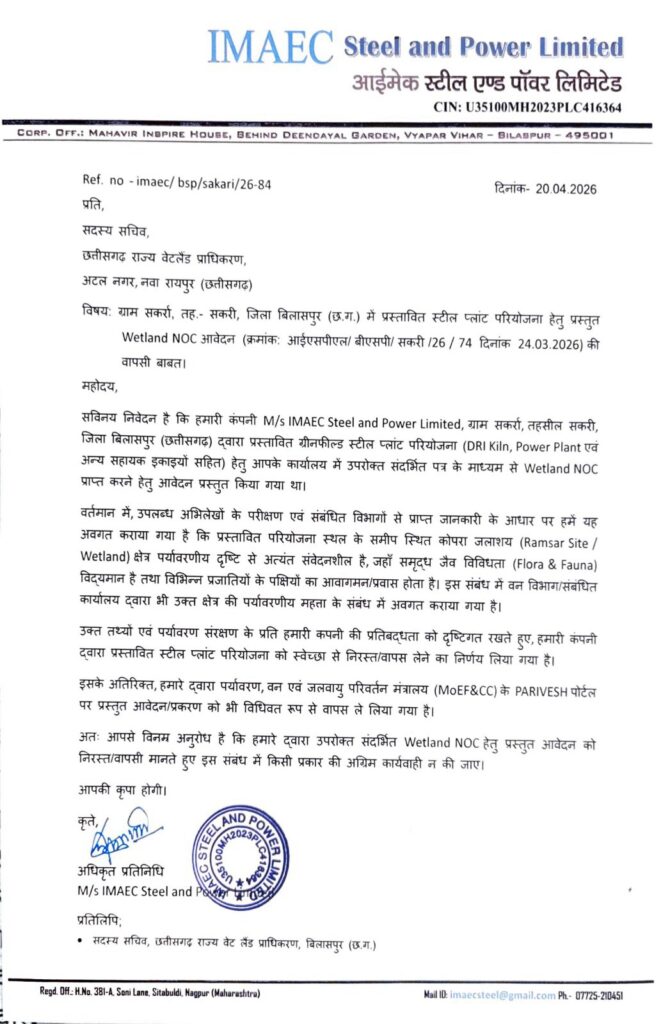 कंपनी द्वारा 20 अप्रैल 2026 को भेजे गए पत्र में बताया गया कि ग्राम सकरी, तहसील सकरी, जिला बिलासपुर में प्रस्तावित इस परियोजना के लिए वेटलैंड NOC हेतु आवेदन 24 मार्च 2026 को प्रस्तुत किया गया था। हालांकि, पर्यावरणीय संवेदनशीलता को देखते हुए अब इसे वापस लेने का निर्णय लिया गया है।