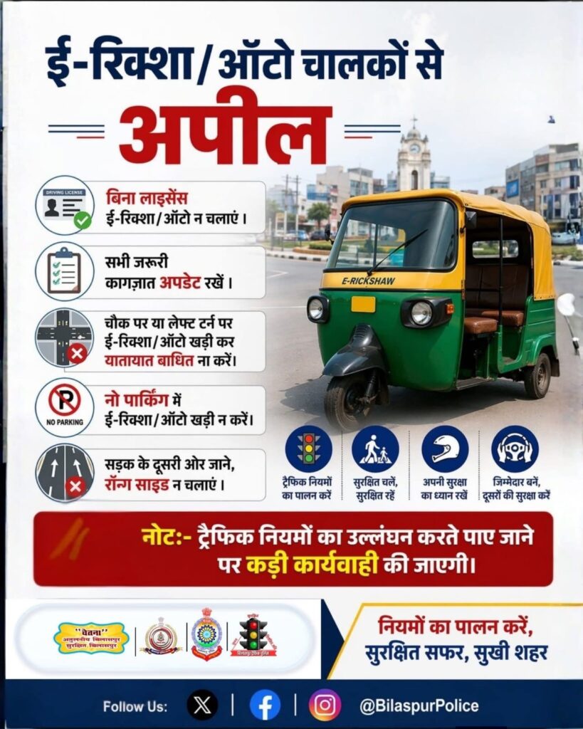बिलासपुर।शहर में यातायात व्यवस्था को अधिक सुरक्षित, सुव्यवस्थित और पारदर्शी बनाने के उद्देश्य से यातायात पुलिस द्वारा ऑटो चालकों के लिए यूनिफॉर्म धारण करने का अभियान तेज कर दिया गया है। इस पहल का मुख्य उद्देश्य ऑटो चालकों की स्पष्ट पहचान सुनिश्चित करना है, जिससे यात्रियों में विश्वास बढ़े और असामाजिक गतिविधियों पर अंकुश लगाया जा सके।