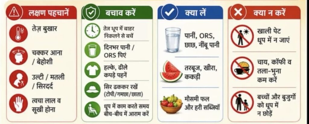 तेज धूप में बाहर निकलने से बचें, विशेषकर दोपहर के समय। दिनभर पर्याप्त मात्रा में पानी या ओआरएस का सेवन करें। हल्के और ढीले कपड़े पहनें तथा बाहर जाते समय सिर को टोपी, गमछा या छाते से ढककर रखें। धूप में काम करने वाले लोग बीच-बीच में आराम जरूर करें।