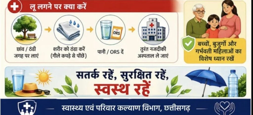 यदि किसी व्यक्ति को लू लग जाए तो उसे तुरंत छांव या ठंडी जगह पर लाएं। शरीर को ठंडा करने के लिए गीले कपड़े से पोंछें और पानी या ओआरएस दें। स्थिति गंभीर होने पर बिना देर किए नजदीकी अस्पताल ले जाएं।स्वाथ्य विभाग ने नागरिकों से अपील की है कि गर्मी के इस मौसम में सतर्क रहें, सुरक्षित रहें और अपने स्वास्थ्य का विशेष ध्यान रखें।