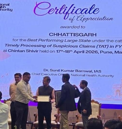 रायपुर।आयुष्मान भारत प्रधानमंत्री जन आरोग्य योजना के प्रभावी, पारदर्शी और परिणामोन्मुख क्रियान्वयन के लिए छत्तीसगढ़ को राष्ट्रीय स्तर पर बड़ी उपलब्धि प्राप्त हुई है। राष्ट्रीय