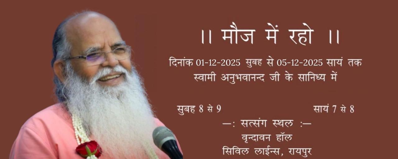 स्वामी अनुभवानन्द जी का पाँच दिवसीय प्रवचन शिविर 1 से 5 दिसंबर तक,वृन्दावन हॉल, सिविल लाइन्स, रायपुर में